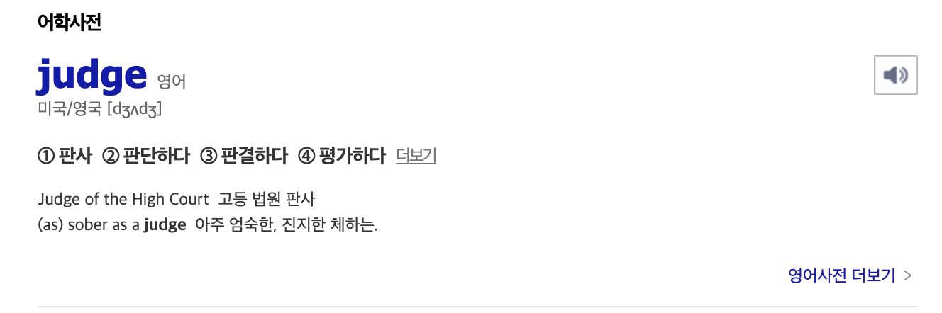 사전에서 나오는 뜻으로는 명사로는 판사, 그 외에 동사로는 판단, 판결, 평가 라는 뜻으로 나오긴 한다.