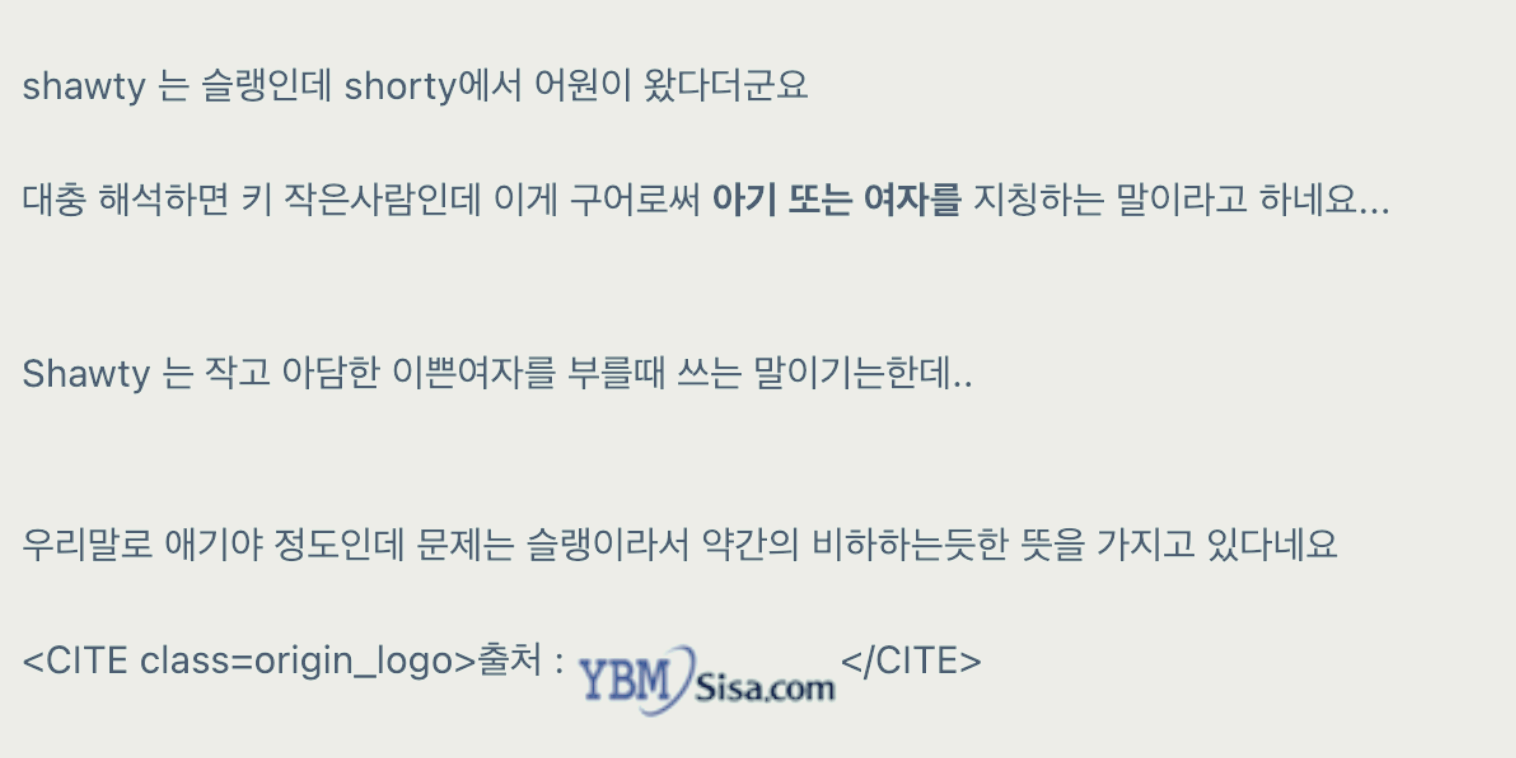 이제는 케이팝 가사에도 등장하는 shawty 셔ㄹㄷㅣ~