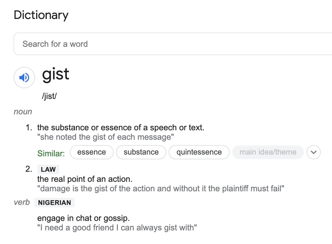 gist 라는 표현으로, 기스트가 아니라 지스트 /jist/ 라고 발음한다.