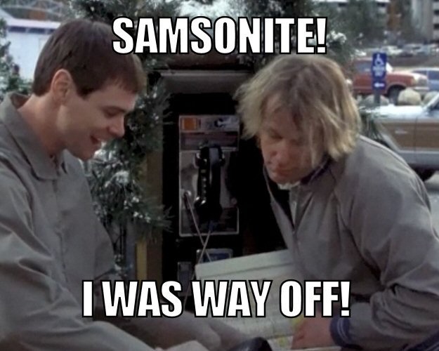 그걸 듣고 "아 맞다 샘소나이트였어! 나 한참 잘못 짚었네/나 완전 틀렸네 (I was way off!)"