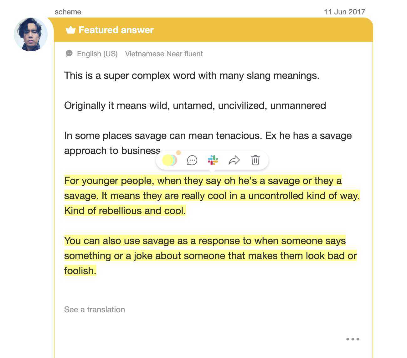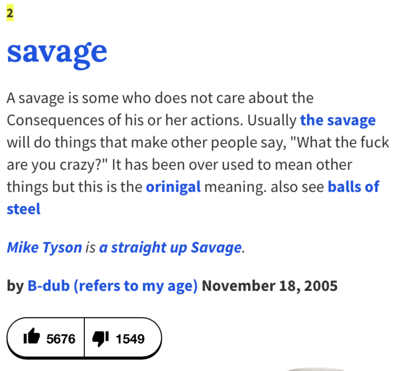 2. 누가 날 얕잡아보는 말을 하거나 농담을 던지면 그에 대한 띠꺼운 대답으로 'savage'라고 답할 수도 있음. (존나 상처주네? 같은 표현으로 화답하는 것인듯)
