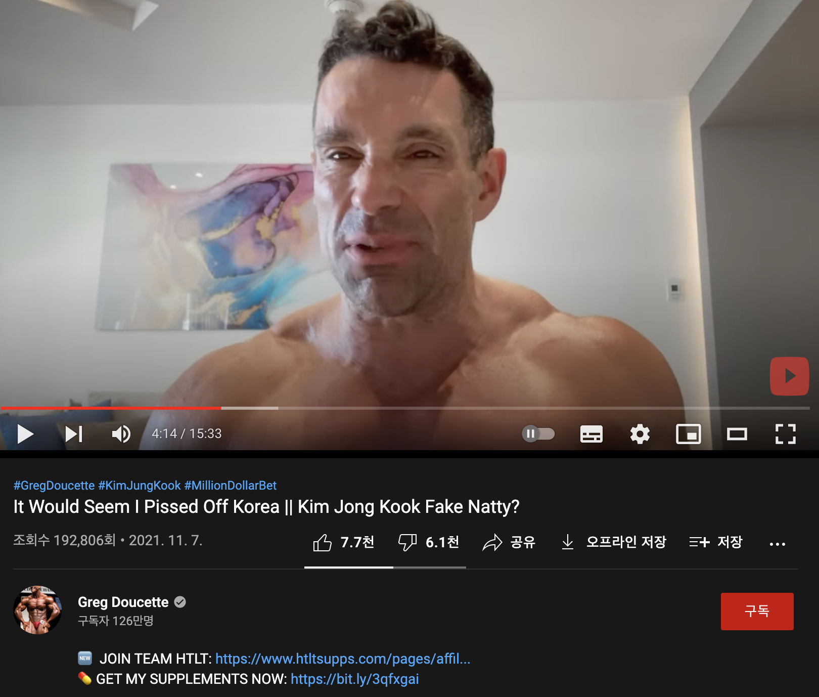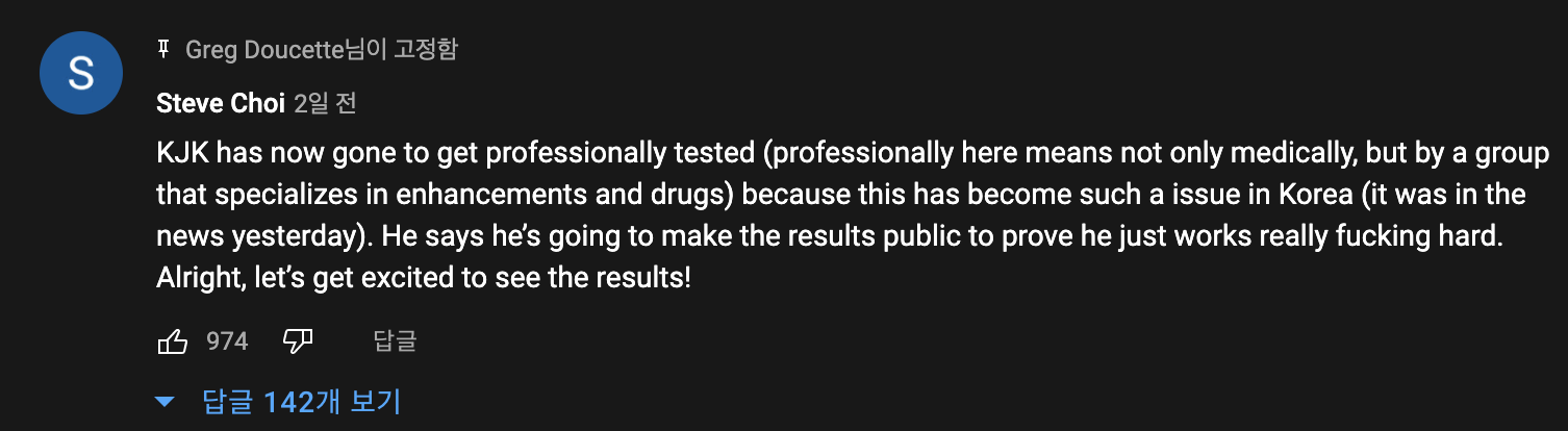 한국에서 니가 말한 게 어제 뉴스에 났고, 그게 너무 이슈가 된 나머지 김종국 본인이 직접 전문적인 약물 복용 여부 검사를 받으려고 (여기서 전문적이라는 의미는 의학적인 게 아니라, 아예 운동능력 향상이나 약물 관련 검사만 집중적으로 하는 기관을 의미함) 한다고 하네.