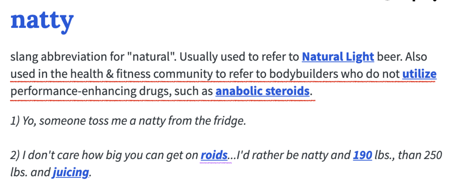 - 헬스 & 피트니스 부문에서 쓰이는 속어로, 아나볼릭 스테로이드와 같은 운동능력 향상 약물을 사용하지 않고 몸을 만드는 사람을 일컫는 말